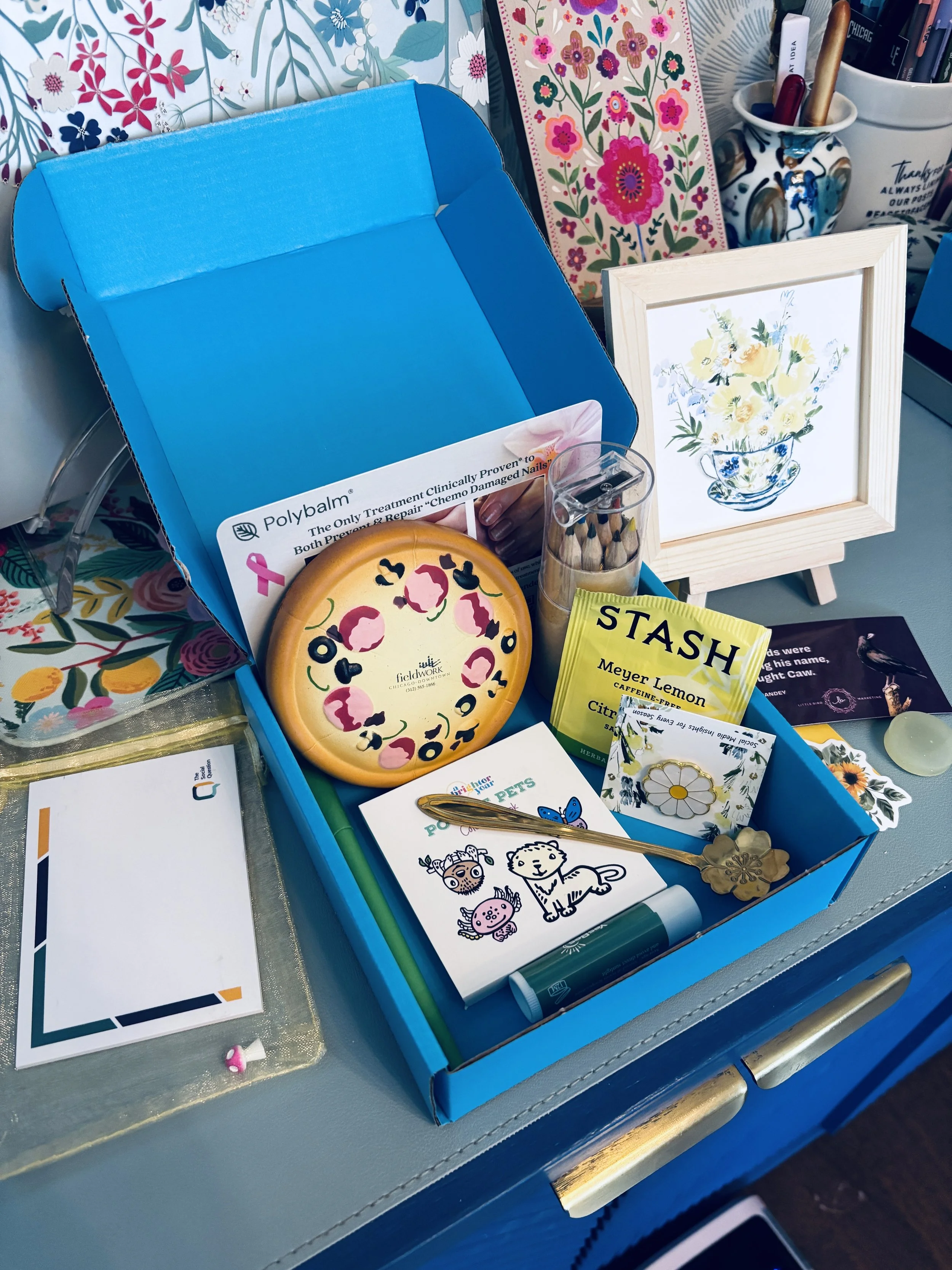 Something else I’ve been focused on heavily this year is the power of hobbies and leaning into how these “side quests” really fuel my creative side and energy in a traditional “desk/computer” type job. I found these mini coloring books from a social media ad (because of course I did!) and matching mini colored pencil sets and honestly planned this entire box and sizing around fitting these items in. Square coloring book, square print and frame, square box. The coloring books came in 5 different designs so people got all different ones. And likewise to the print + frame, why send a coloring book with no way to actual color? Didn’t want to assume people had access to crayons or colored pencils and they deserved their own set. Pictured just outside the box is a floral sticker to add to an item of your choice (computer, phone, desk - add a little more sunshine to your day). And cut off from the photo are mini mushrooms! I thought these would be adorable added to a plant or even just a little desk ornament. It was spontaneous and a last minute addition.