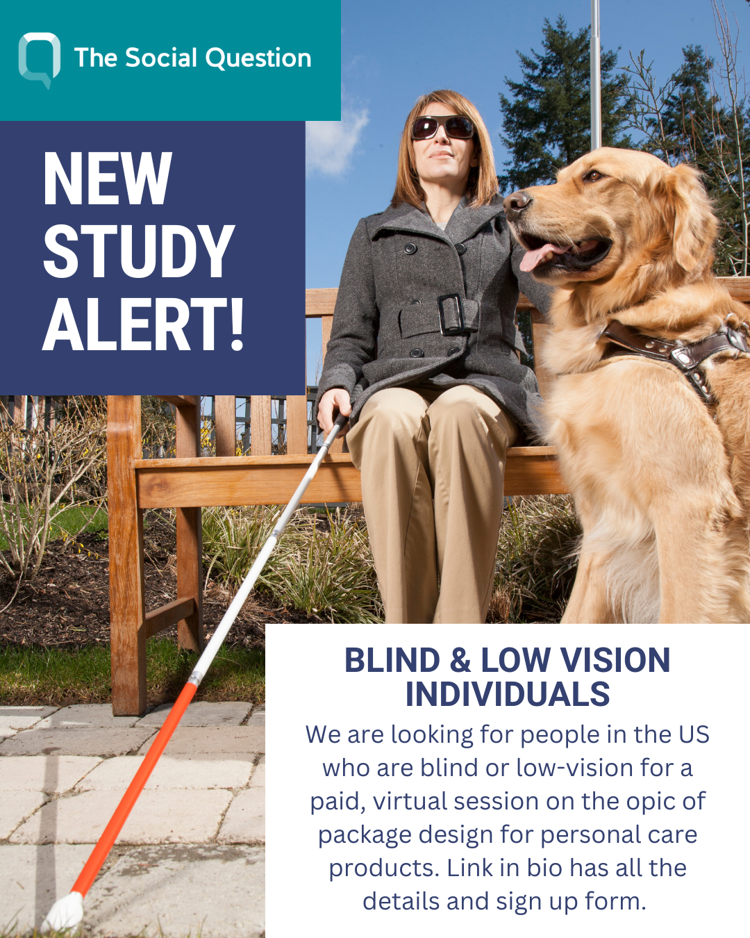 Open call for people in the US (men and women) ages 18+ who are blind or low vision. These will be virtual interviews on the topic of product packaging and design in the personal care space.